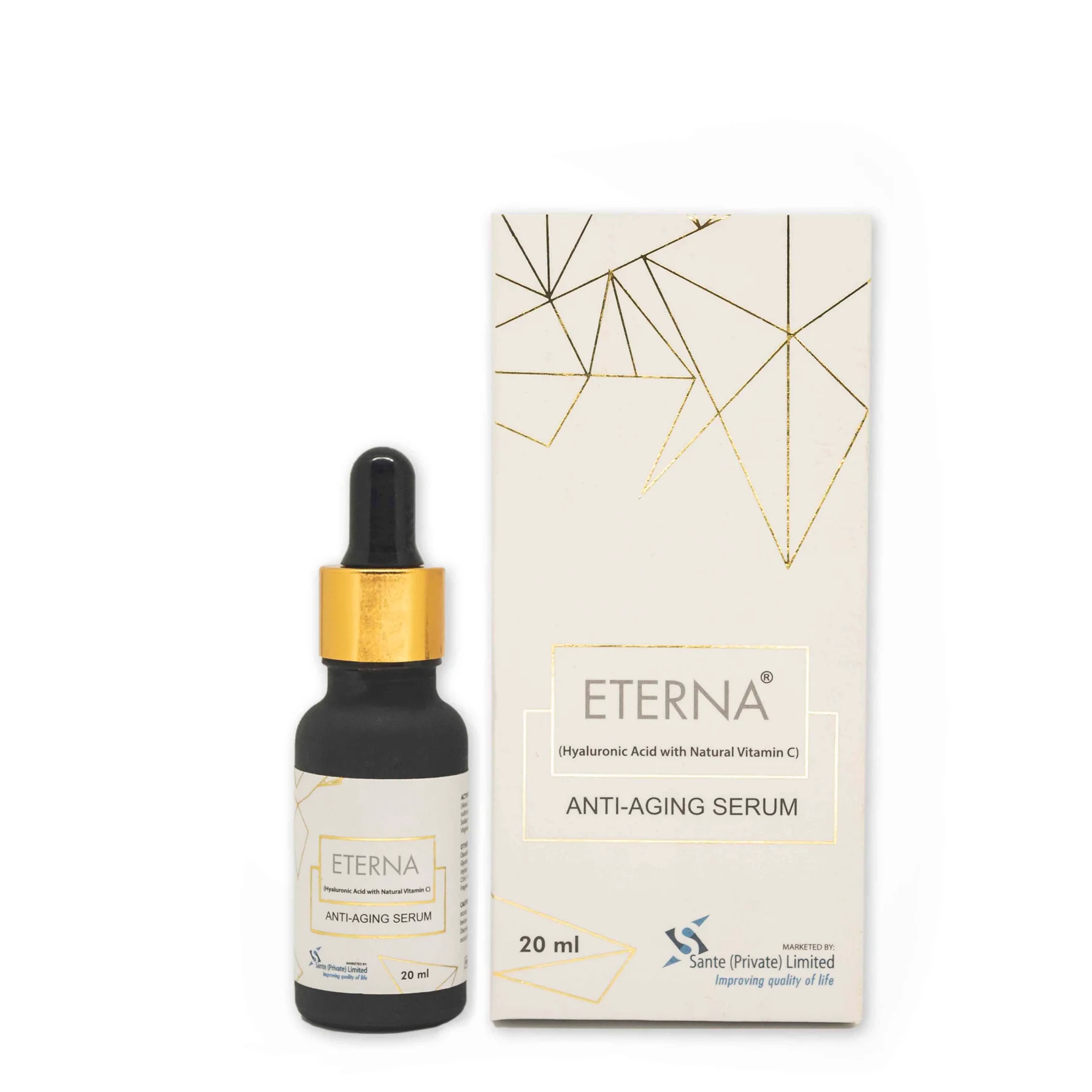 ETERNA Anti-Aging Serum is a rejuvenating blend of Hyaluronic Acid and Natural Vitamin C that hydrates, firms, and brightens the skin, reducing fine lines, boosting elasticity, and restoring youthful radiance.