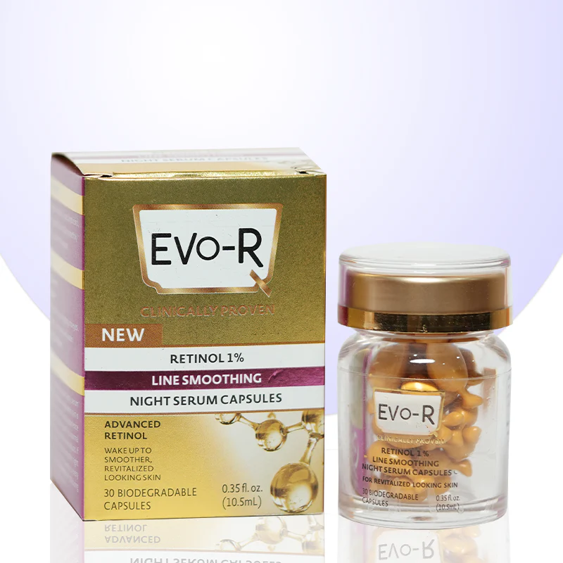 Evo-R Retinol 1% Line Smoothing Night Serum Capsules smooth fine lines and improve skin texture while you sleep. The biodegradable capsules ensure precise doses of retinol for effective results.
