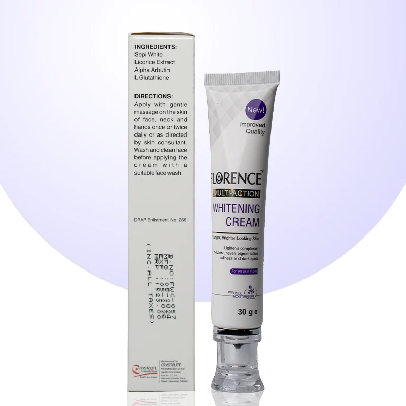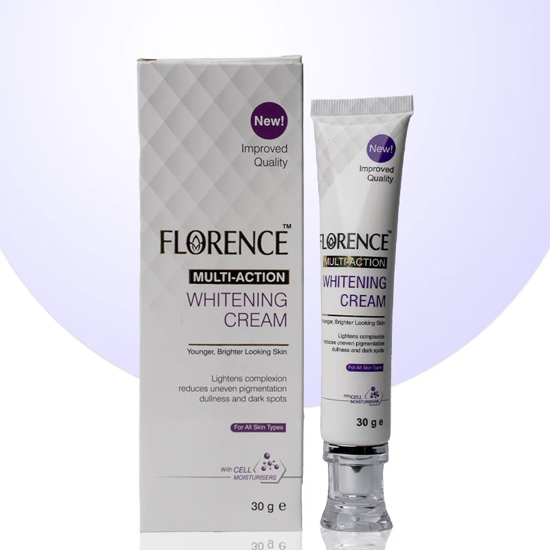 Transform your skin with Florence Multi-Action Whitening Cream. This formula lightens complexion, reduces dark spots, and improves uneven pigmentation, giving you a youthful, radiant glow. Suitable for all skin types, it deeply moisturizes while addressing dullness and blemishes.