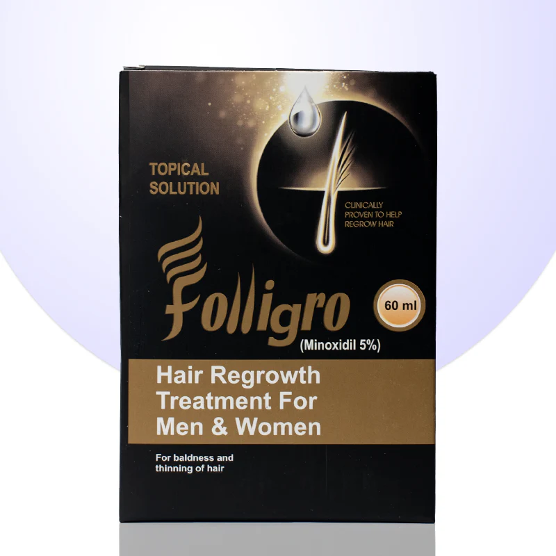 Folligro Hair Regrowth Treatment (5% Minoxidil) helps promote natural hair regrowth for men and women, targeting baldness and thinning hair for thicker, fuller hair.