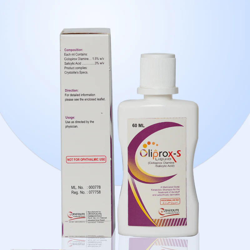 Oliprox-S (60ml) is a medicated scalp liquid with Ciclopirox Olamine and Salicylic Acid, designed to treat dandruff and seborrheic dermatitis by relieving scalp irritation and reducing flaking.