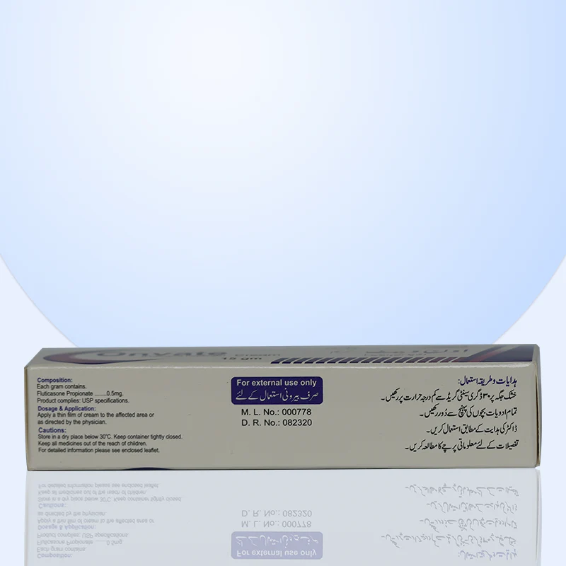 Onvate Cream (Fluticasone Propionate) is a topical treatment used to reduce skin inflammation and treat conditions such as eczema, dermatitis, and allergies. It helps to soothe irritated skin and relieve redness and itching.