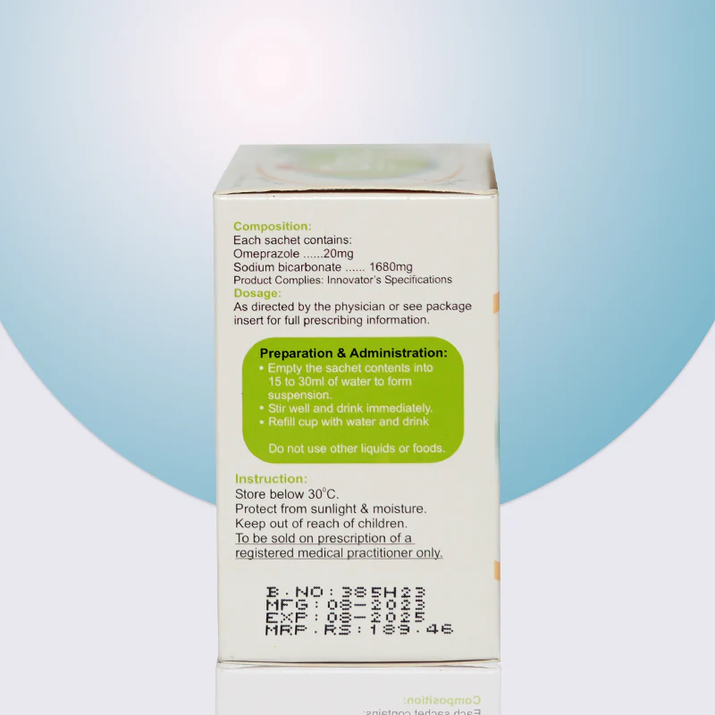 • Pack Size: Contains 20mg of Omeprazole in each sachet.