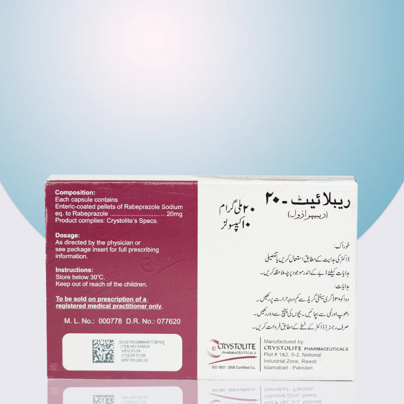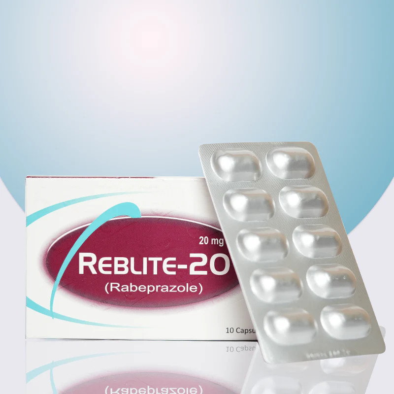 Reblite-20 (Rabeprazole 20mg) is a medication used to treat acid reflux, heartburn, and stomach ulcers. It works by reducing the production of stomach acid, helping to relieve discomfort and prevent further damage caused by excess acid.