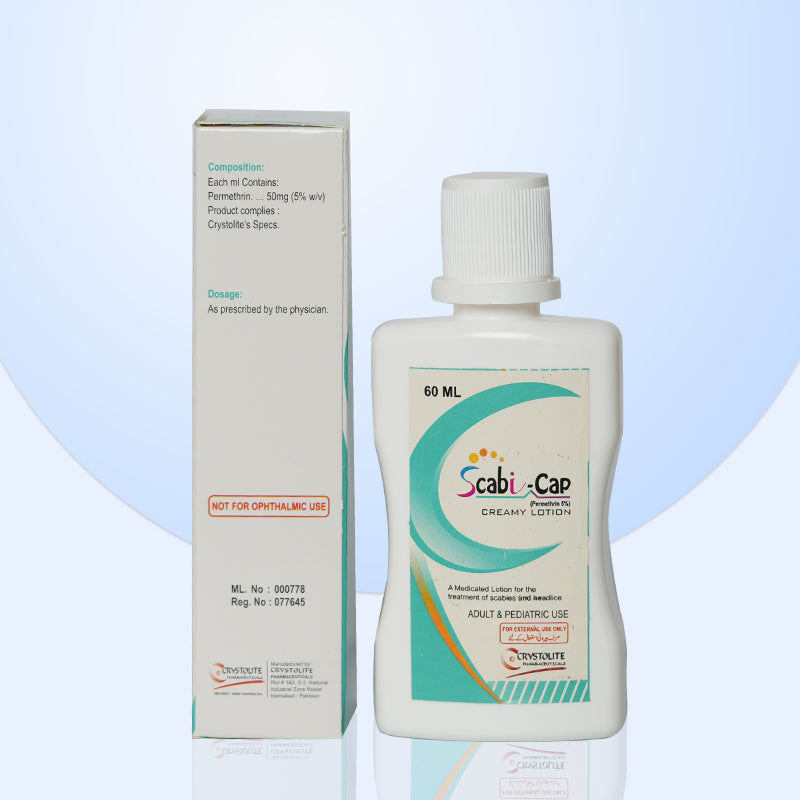 Scabi-Cap Creamy Lotion (Permethrin 5%) is a medicated lotion used to treat scabies and head lice. It provides quick relief by killing the mites and lice that cause irritation and itching.