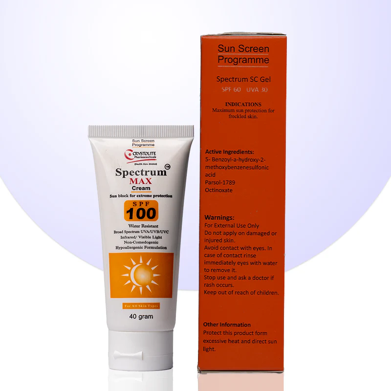 Spectrum Max Sun Block SPF 100 is designed for those who need the ultimate sun protection. Offering broad-spectrum coverage against UVA, UVB, and UVC rays, it helps protect your skin from harmful sun damage, including visible and infrared light. This sunblock is perfect for anyone who spends a lot of time outdoors, whether at the beach, hiking, or simply enjoying the sun.