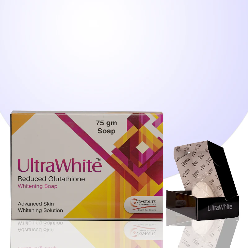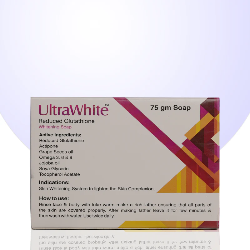 UltraWhite Whitening Soap with reduced glutathione brightens and evens out skin tone, reducing dark spots and hyperpigmentation for a glowing, radiant complexion.